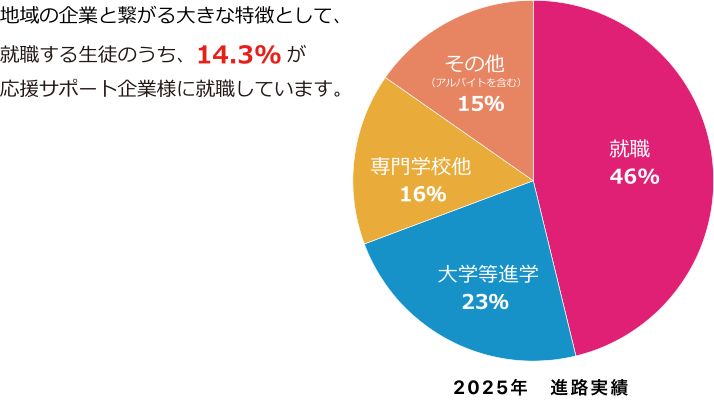 進学では多数の指定校があり、就職では応援サポート企業様と協力してインターンシップ制度を実施しております。
