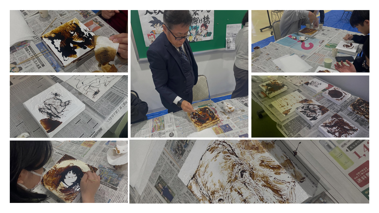 制作では、前月に準備した下地に濃度の高いコーヒー液を垂らしたり、水を含ませて濃淡をつけたり、コーヒーの粉を直接かけたりと、自由に思いのままに表現。コーヒーならではの独特な色合いと質感が生み出す、なんとも言えない癒しの世界を体験しました。