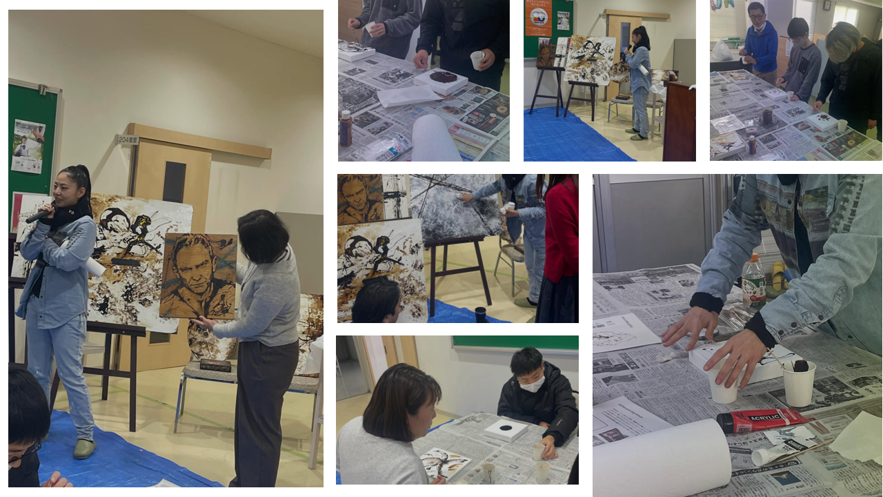 11月はオンラインで東京と本校、高松キャンパスを繋ぎ、白いキャンバスに白いアクリル絵の具を塗る下地作りからスタート。12月には、minori先生に東京から直接お越しいただき、対面での制作指導を受けました。